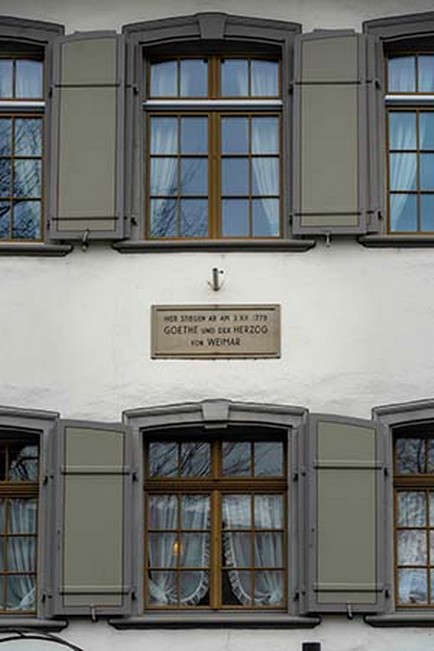 No leste da Suíça a língua predominante é o alemão. Mas na vida cotidiana, entre amigos, no trabalho e até na administração, o que predomina é uma variedade dialetal que às vezes é chamada de 'Schwyzerdütsch' (alemão suíço) em oposição a 'Schriftdeutsch' (alemão escrito, mais exatamente alemão padrão). Já na época da Reforma, um certo Sr. Lutero tomou a liberdade de criticar o alemão do seu contemporâneo e reformador suíço, Huldrych Zwingli (1484 – 1531). Os suíços, por sua vez, nunca perdoaram ao alemão Friedrich Schiller (1757 – 1805) ter escrito o drama nacional Willhelm Tell, ele, Schiller, que nunca pôs os pés na Suíça. Já Johann Wolfgang von Goethe goza de todo reconhecimento possível por parte dos suíços, pois visitou a Suíça e, como se não bastasse, ainda passou uma noite em Frauenfeld, como pode ser visto na foto a seguir.